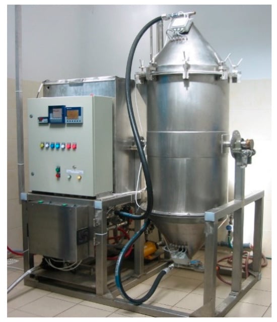 In cooperation with the Łukasiewicz, Institute for Sustainable Technologies (LIST), in Radom, a large-scale device for degumming fibrous plants in the system of periodic operation was designed and built (Figure 1) []. The device allowed to processing of raw material in the amount of 20 kg of hemp and 15 kg of flax straw. The raw material is loaded through an openable collector). In the next stage, a prototype of the device for the osmotic degumming of bast plant fibers in the system of continuous operation was created (Figure 2) [].