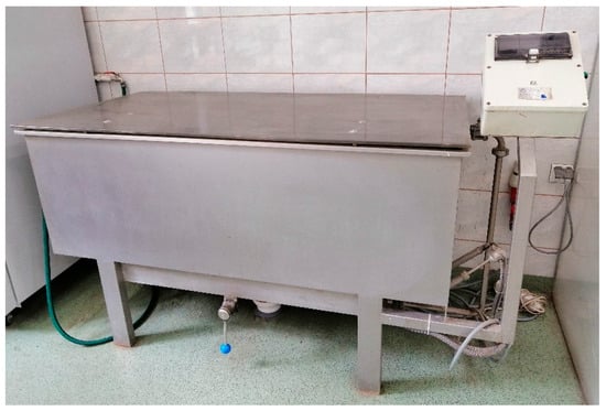 The straw was placed in a tank (Figure 4) parallel to each other, secured against flowing out, and flooded with water. The retting process was carried out at a water temperature of 30 °C, a ratio of 1:10 (1 kg of straw per 10 dm3 of water), process time of 72 h for flax, and 144 h for hemp. Laboratory tests included 3 kg of raw material. Next, the straw was rinsed using cold water and dried in a laboratory dryer at 60 °C air temperature for 48–72 h. The mechanical processing of the degummed straw was carried out using the laboratory scutching unit.
