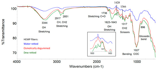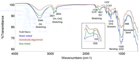 The research showed that the structural analysis (ATR tests) of all the fiber samples tested were similar and typical of flax and hemp. In all tests, flax and hemp fibers were identified with the same bands corresponding to the vibrations of functional group bonds, such as OH, C=O, C=C, COO, CH, CH2, CH3, COC, and CO. The tests show that the mentioned functional groups originate from the chemical components of the fibers, i.e., cellulose, hemicellulose, lignin, and pectin, as well as waxes and fats, and are closely related to each other.