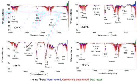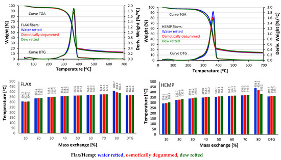 For hemp, the maximum heat release rate (HRRmax) was reached for the water-retted fibers (Figure 12). For the dew-retted fibers, the HRR decreased by 9.7 W/g, whereas the temperature remained the same for 0.8 s less time compared to the water-retted fibers. The lowest HRRmax value was obtained for the osmotically degummed fibers, which was more than 23% lower compared to the water-retted fibers, as statistically confirmed.