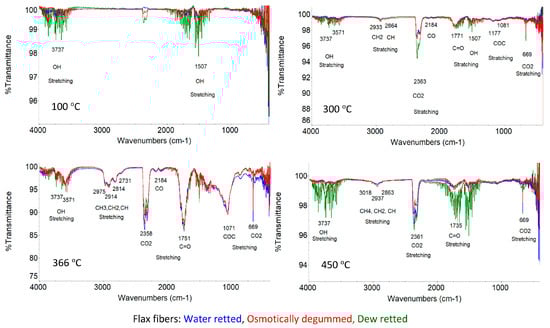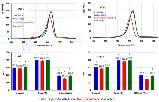 The maximum heat release rate (HRRmax) was reached for dew-retted flax fibers. For the water-retted fibers, a similar result was obtained: HRR decreased by 1.75 W/g, whereas the temp increased by 1 °C in a shorter time of 8.5 s compared to the dew-retted fibers. The lowest HRRmax value was obtained for the osmotically degummed fibers, which was more than 20% lower compared to the dew-retted fibers.