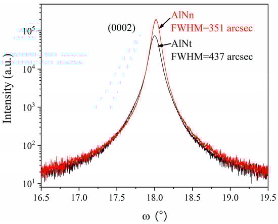 (0002) XRC of AlNt and AlNn by HR-XRD.