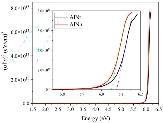 The optical bandgap energy (Eg) of AlN can be obtained by extrapolating the linear part of the proportional dependence of (α)2 vs. photon energy () by Formula (4), known as the Tauc plot [32]. The values of Eg can be calculated by linear fit close to the absorption edge (Dotted lines in green and purple), as shown in smaller image of Figure 4. Where the smaller built-in image in Figure 4 is the enlarged view of Figure 4. Thus, the bandgap of the two samples can be seen in Figure 4: Eg (AlNt) = 6.08 ± 0.03 eV and Eg (AlNn) = 6.05 ± 0.03 eV, as shown in Table 2.