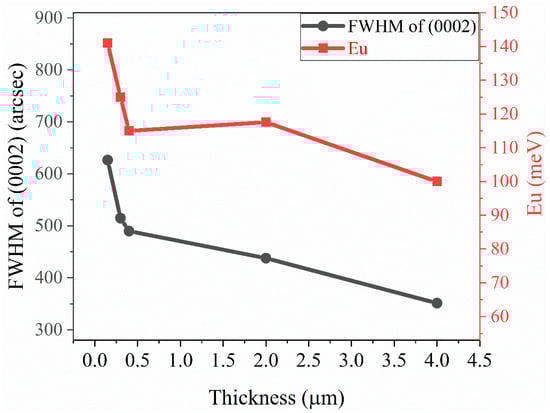 Comparison between FWHM (0002) by HR-XRD and Urbach’s binding energy (Eu) as a function of AlN epi-film thickness by OT. The data for S1 (150 nm), S2 (300 nm), and S3 (400 nm) are from Ref. [17] for comparison.