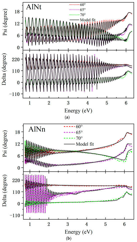 Figure 8a,b presents the experimental SE spectra and fitting curves of psi (Ψ) and delta (Δ) at 300 K with three incident angles of 60°, 65°, and 70° for two AlN samples. The experimental and fitting results are in good agreement. The interference oscillations below the bandgap edge correspond to the transparent region of the AlN sample. The final fitting results with parameters of the surface roughness, epilayer, and interlayer thicknesses for both AlN samples are listed in Table 2. In the meantime, the optical constants of AlNt and AlNn samples, such as refractive index (n) and extinction coefficient (k), vs. the photon energy, are extracted by SE fitting at 300 K and shown in Figure 9. The optical bandgap energy (Eg) of AlN can be obtained by extrapolating the linear part of the proportional dependence of (α)2 vs. photon energy () by Formula (4), known as the Tauc plot [32]. Thus, the bandgap of the two samples can be seen in Figure 10: Eg (AlNt) = 6.11 ± 0.01 eV and Eg (AlNn) = 6.10 ± 0.02 eV, as shown in Table 2.
