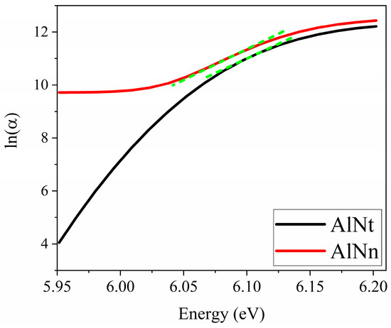 To better compare the two samples, AlNt and AlNn, the dependence of the absorption coefficient on photon energy can be used through the formula [32]: