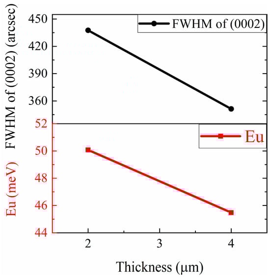 Figure 6 shows Urbach’s binding energy Eu compared with the FWHM of (0002) vs. the thickness of AlN. We obtain the Eu of AlNt and AlNn by OT as 117.56 meV and 99.97 meV, respectively. It shows that the obtained Eu (red solid squares in Figure 6) is decreased with AlN epilayer thickness, which corresponds to the FWHM of HR-XRD results discussed before (black solid circles in Figure 6), i.e., an improvement of structural quality. The high correlation between OT-derived Eu and HR-XRD FWHM predicates that the AlN crystalline quality can be demonstrated from the spectral properties in the vicinity of the band edge. The data for S1 (150 nm), S2 (300 nm), and S3 (400 nm) are from Ref. [17] for comparison.
