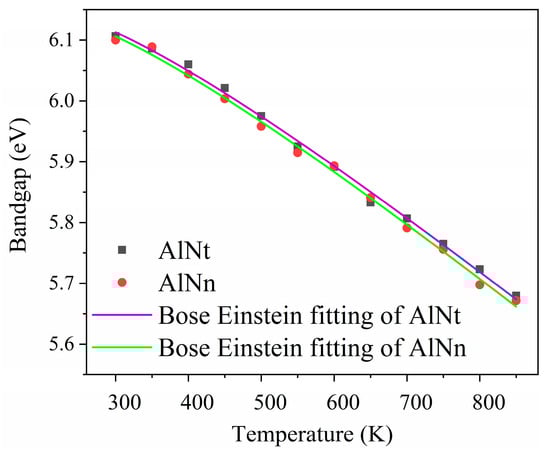 Figure 15a,b show ()2 vs. photon energy () of AlNt and AlNn at 12 temperature points between 300 K and 850 K. The optical bandgap energy (Eg) of AlN can be obtained by extrapolating the linear part of the proportional dependence of (α)2 vs. photon energy () by Formula (4) [32]. It is observed that with the temperature rising, the absorption edge shifts to the lower energy, together with the enlarged band tailing, i.e., the redshift of the bandgap. Figure 16 depicts the dependence of the bandgap on temperature (T) for the two AlN films. The bandgap energy of both samples exhibits an apparent redshift with the increase in temperature. These results are due to the dominant electron–phonon interactions being stronger than the weak contribution of thermal expansion [36,37].