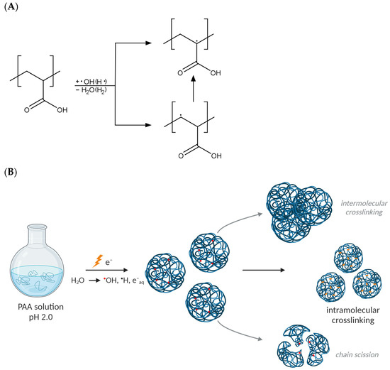 Upon the high-dose-rate irradiation of dilute aqueous polymer solutions with short pulses of fast electrons (the so-called pulse radiolysis regime), energy is absorbed both by macromolecules and water; however, only the latter effect is significant due to the immense prevalence of water molecules in the system. This in turn leads to water radiolysis (in a time interval lasting ca. 10−12 s) and the abundant generation of reactive species, such as hydroxyl radicals, hydrogen atoms and solvated electrons [39,40]. The yields of the particular products of water radiolysis depend on the irradiation conditions; however, at a low pH and in the presence of inert gases, such as argon, mostly hydroxyl radicals and hydrogen atoms play a role in the formation of polymer radicals (macroradicals) by hydrogen abstraction from the macromolecules [41,42]. The location and fate of macroradicals depend greatly on the chemical structure of the given polymer. In the case of PAA, α- and β-carboxyalkyl radicals are formed, as depicted in Figure 1A. Due to the fact that PAA is a weak polyelectrolyte, polymer chain dynamics and, as a consequence, the rates of macroradical reactions depend strongly on the pH level. In alkaline and neutral solutions, the negative charges of dissociated carboxylic groups cause repulsive forces to act between polymer segments, thus slowing down reactions between macroradicals and thus promoting single-radical-induced reactions, mainly chain scission [43]. To avoid this effect, and also to induce a coiled conformation of PAA macromolecules suitable for nanogel synthesis, the irradiation of PAA solutions in this work is performed at pH 2.0. Noteworthily, possible reactions of the radiation-generated macroradicals are recombination (leading to crosslinking, both inter- and intramolecular) and chain scission (Figure 1B). Intramolecular crosslinking is the most desired reaction that enables the formation of polymeric nanostructures—nanogels. It occurs when two radicals on the same polymer chain recombine and results in a virtually unchanged molecular weight followed by a decreased radius of gyration and intrinsic viscosity [44,45]. If changes in molecular weight are found, it indicates the contribution of either intermolecular crosslinking or chain scission in the case of increase or decrease in the molecular weight, respectively. Since, for intramolecular crosslinking, a number of radicals must be present simultaneously at one chain, specific reaction conditions are required, namely, subjecting polymer solutions to a short high-dose pulse (or a series of pulses) of ionizing radiation, allowing the generation of a high concentration of radicals within a short time. Therefore, these reactions were studied for PAA by irradiating its deoxygenated solutions at varying concentrations in the pulse radiolysis regime. To date, we examined the PAA of initial average molecular weight of ca. 0.5 MDa [46] and 1 MDa [47]—despite the conditions promoting intramolecular crosslinking, namely, low concentration and high dose rate, PAA radiation processing led to complex changes in the weight-average molecular weight (Mw) and radius of gyration (Rg), implying the combination of all three possible pathways of radical reactions. Therefore, we postulate that the understanding of the complicated synthetic processes leading to the formation of PAA nanogels could benefit from modern analytic modalities.