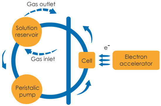 Polymer irradiation was performed by a pulsed beam of high-energy electrons in a preparative pulse radiolysis regime, as described previously [47], with slight modifications. In short, 500 mL of a poly(acrylic acid) aqueous solution was prepared by dissolving polymer stock in water at 60 °C with moderate overnight stirring. The concentrations used in the experiments ranged from 10 mM to 25 mM. Prior to irradiation, the pH of the solution was set to 2.0 with HClO4 to protonate the carboxylic groups of polymer and thus compact the coils. Irradiation run for each solution was conducted at ambient temperature in a deoxygenated closed-loop system (circulation velocity 1 mL s−1), under continuous argon saturation. A schematic representation of the irradiation setup is depicted in Figure 2.