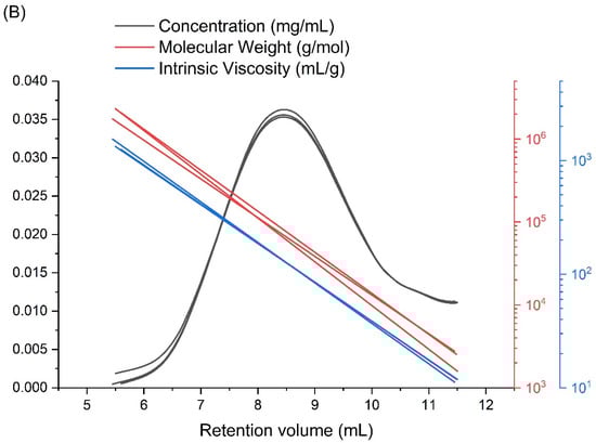 Since the radiation synthesis of nanogels represents a very interesting alternative for classical chemistry approaches [58,59,60,61,62,63], there is no surprise that there is a growing interest in it. Since the first reports in late 1990s [44,45], there has been a growing number of studies on the radiation approach [24,25,32,34,64]. However, the process is still under investigation, and new methods have been employed to delve deeper into understanding the changes that occur in the polymers upon pulsed irradiation in a solution. Classically, the first-choice method used for the characterization of nanogels, including those based on PAA, is batch multi-angle static laser light scattering (MALLS) performed with a device equipped with a goniometer [47]. This allows the application of a broad spectrum of angles and, therefore, provides robust results. However, measurements performed with such a setup are tedious and time-consuming, and the obtained values, such as weight-average molecular weight, describe only the bulk, averaged properties of all macromolecules present in the solution. Therefore, in this paper, we employed a modern gel permeation chromatography system to improve our workflow and to obtain more insights into the mechanism of synthesis processes and into the structure of the synthesized samples. Our novel device was equipped with a MALLS detector operating at seven fixed angles as well as a combined differential refractive index and viscosity detector. Thus, we were able to not only evaluate the molecular weight of the polymer coils, but also investigate the changes in intrinsic viscosity at the same time. Moreover, we gained insights into the distribution of these values, which extends beyond what we were able to explore with classical batch MALLS or viscometry. The application of the multidetector (multi-angle laser light scattering (MALLS), differential pressure (viscosity) (DP), differential refractive index (DRI)) gel permeation chromatography for the analysis of nanogel synthesis also allowed us to obtain the following: