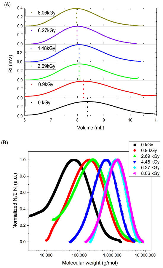 Polymer irradiation was performed by a pulsed beam of high-energy electrons, as described in Section 2.2. After irradiation, the collected samples were analyzed (in triplicate) by gel permeation chromatography (Section 2.3).