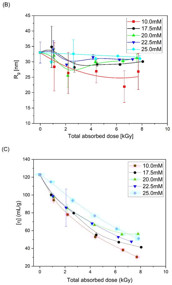 Based on the obtained chromatograms, the weight-average molecular weight (Mw), radius of gyration (Rg) and intrinsic viscosity [η] of all products were calculated. Changes in these parameters as a function of total absorbed dose are presented in Figure 5. One can see that, together with the increase in molecular weight (regardless of PAA solution concentration), almost no change or slight decrease in the radius of gyration and a pronounced decrease in the intrinsic viscosity are observed, which is a typical feature that indicates intramolecular crosslinking as the dominating process and intermolecular crosslinking occurring side-by-side.