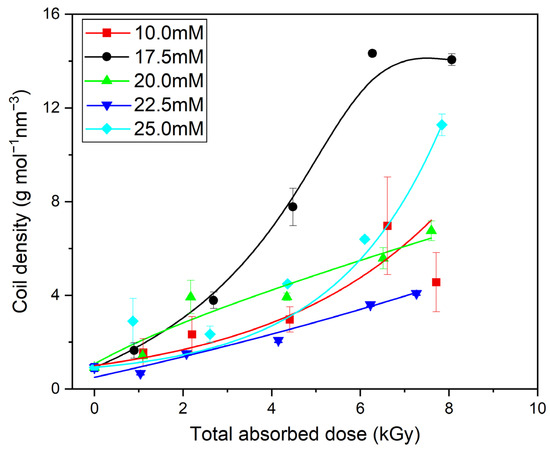 The α-parameter is a scalar value that is related to the stiffness of the polymer chains. In general, despite some scatter in the data, it is clear that, for all concentrations, the α values for the irradiated solutions are lower than the starting value of 0.71; for the lower concentrations, a clear decreasing trend is observed. For instance, for the 17.5 mM solution, with the increase in the absorbed dose, the α-parameter decreases to 0.5. This indicates an increase in segment–segment interactions, as this value is characteristic for the Flory theta solvent, pointing to a compact structure in contrast to an expanded, loose coil, corresponding to an α value of 0.7–0.8. An interesting phenomenon was observed for the 25 mM PAA solution. Regardless of irradiation, the α value is almost constant (around 0.6), which may be a result of polymer–polymer interactions in the solution of the highest concentration.