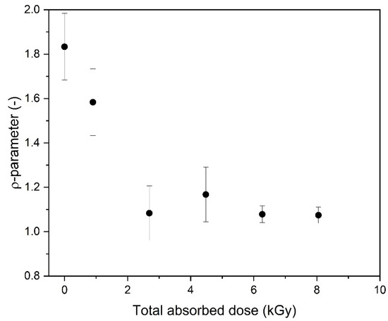 The formation of highly intramolecularly crosslinked macromolecules, i.e., nanogels, was also confirmed by the calculation of the ρ-parameter (ratio between the values of the radius of gyration (Rg) and hydrodynamic radius (Rh) obtained by means of static and dynamic light scattering, respectively). According to Burchard [55], it sensitively reflects the actual segment density as a result of the corresponding hydrodynamic interaction. Changes in the ρ-parameter for the 17.5 mM PAA solution as a function of the totally absorbed dose are presented in Figure 7. While in our case, the presented ρ values should be treated as approximate (Rg and Rh were determined in this paper in different solvents; see the Experimental Procedure Section), and the error bars are relatively large, it is clear that, while for the unirradiated sample the value (1.8) is characteristic for solutions of flexible, random coils of moderate polydispersity [55,67], the ρ-parameter becomes significantly lower for the irradiated samples, reaching a value of around 1, which is typical for highly branched or even hard, impermeable particles.