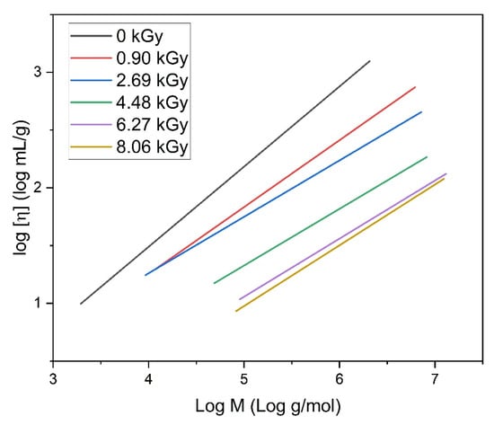 In Figure 8, the light scattering and viscosity measurement data obtained for the representative PAA solution of 17.5 mM concentration in a double logarithmic coordinate system resulting from the Mark–Houwink equation () are shown. This kind of representation allows us to evaluate the α-parameter from this equation. The value of the α-parameter determined by GPC/SEC for the non-irradiated solution is 0.71, which means that a 0.1 M Na2HPO4 aqueous solution is a thermodynamically good solvent for poly(acrylic acid). The values obtained for all irradiated solutions are presented in Table 2.