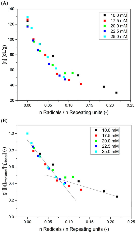 In Figure 9 (based on the data presented in Figure 5C), the changes in (A) intrinsic viscosities and (B) contraction factor () as a function of the ratio between the total number of radicals generated at a single coil (calculated on the basis of the absorbed dose and polymer concentration; no correction for •OH self-combination was applied) to the number of repeating units (calculated on the basis of molecular weight) are presented. One can see that the values of the intrinsic viscosity for different poly(acrylic acid) concentrations, but for an equal ratio between the number of radicals and the number of repeating units, are similar. An analogous behavior was observed through the Monte Carlo simulations of the intermolecular recombination of radicals [27]. That indicates that the products of a similar crosslink density can be obtained by the proper choice of the initial polymer concentration and applied radiation dose.