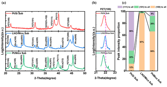 For the fabricated PZT thin film in this work, its composition is located at the morphotropic phase boundary (MPB) in the PbZrO3-PbTiO3 phase diagram, which means a mixed phase of tetragonal (T phase) and rhombohedral (R phase) [23,24]. The polarization of Pb(Zr,Ti)O3 in the T phase points to the (001) direction, while that in the R phase points to the (111) direction. For (001)/(100)- and (111)-oriented PZT thin films, their polarization can be more easily switched using external stimulation and exhibits a better ferroelectric and piezoelectric response. The orientation preference of PZT films on different substrates could be characterized by the relative intensity of diffraction peaks. Figure 2c further summarizes the percentages of (100)-, (101)-, and (111)-oriented PZT films on the Pt/Si substrate, LNO/Mica substrate, and Pt/Mica substrate, respectively. It can be seen that, for the PZT thin film on Pt/Si substate, the ratio of I(100) + I(111) to I(100) + I(101) + I(111) was 0.78, while that of PZT on LNO/Mica and on Pt/Mica substrate was 0.97 and 0.74, respectively. It was also noticed that the (111) of PZT disappeared when the thin film was deposited on an LNO/Mica substrate. It is evident that the PZT thin film on the LNO/Mica substrate, guided by the LNO layer with the same perovskite structure, exhibits a strong (100) preferred orientation, which may also indicate that the LNO/Mica substrate has the potential to induce greater out-of-plane polarization of PZT films; that is, under the same test conditions, PZT films on an LNO/Mica substrate may exhibit higher remanent polarization.