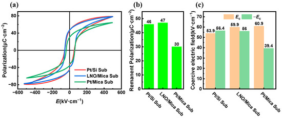 (a) Hysteresis loops, (b) remnant polarization, and (c) coercive field of the PZT thin films on LNO/Mica, Pt/Si, and Pt/Mica substrates.