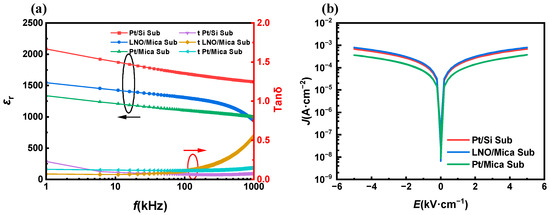 The relative dielectric properties of the PZT thin films were measured in the frequency range from 1 kHz to 1 MHz, and the results are shown in Figure 4a. It is seen that the relative dielectric constant of the PZT thin film fell in the range from 1000 to 2000, while that of the PZT thin film on a Pt/Mica substrate was lower than for the other two substrates. The decrease in permittivity and increase in loss observed in PZT thin films on LNO/Mica substrates above 200 kHz are associated with film inhomogeneities. These inhomogeneities alter the distribution of local depolarization fields, stress distribution within the film, as well as the quantity, depth, and density of charge traps. These result in a significant difference in dielectric response at high frequencies compared to low-frequency conditions. In the design of piezoelectric sensor devices, minimizing the relative dielectric constant of the piezoelectric material is preferred. A smaller dielectric constant leads to reduced sensor capacitance. Electrical signals produced by piezoelectric sensors in response to external stimuli typically require amplification through signal amplification circuits before being read by data acquisition equipment. Common amplification methods include voltage amplifiers and charge amplifiers. Voltage amplifiers primarily enhance voltage signals from the piezoelectric sensor. The voltage signal output by the sensor is inversely proportional to its capacitance for a given quantity of charge, resulting in higher sensitivity when the dielectric constant of the piezoelectric material is smaller. Even when charge amplifiers are employed in the backend circuitry, their upper cutoff frequency is likewise inversely proportional to the sensor’s capacitance. If the sensor’s capacitance is excessively high, the piezoelectric sensing system will be limited to low-frequency operation.