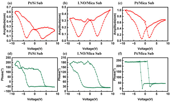 The in-depth assessment of the piezoelectric response of the PZT thin films involved measuring the local piezoelectric responses, including voltage–amplitude and voltage–phase curves [30], as depicted in Figure 6. Remarkable asymmetry was exhibited in the amplitude curves of PZT films on different types of substrates, likely originating from interface effects between the substrates and the PZT thin films. Furthermore, when subjected to a voltage stimulus of −8 V, the PZT thin film on the Pt/Mica substrate demonstrated a remarkable amplitude response of 1 nm, significantly surpassing that of the other two substrates, indicating the highest piezoelectric response among them. At the same time, its phase curve disclosed an exceptionally abrupt polarization reversal when the applied voltage exceeded the coercive field. This suggests that, considering the current fabrication conditions, mica substrates buffered with Pt as both the bottom electrode and the buffer layer are the preferred option for manufacturing flexible piezoelectric thin films.
