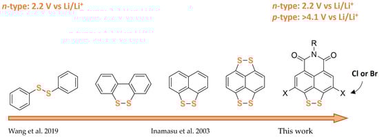Contrary to the low-voltage band, the high-voltage band could be attributed to the oxidation of the peri-substituted disulfides followed by bonding with anions from the electrolyte (TFSI−). This reaction can be classified as a p-type. It is noticeable that for the p-type organic compounds, the highest potentials have so far been reported for phenazine-derived compounds, in which N-atoms are replaced by S and O: for example, 4.1 V for thianthrene and 4.2 V for dibenzodioxin, respectively [24,37]. The comparison shows that SCl8 prepared by us displays even higher potential (i.e., E1/2 = 4.3 V at a scan rate of 1 mV/s, Figure 4), which sets it apart from all previously reported p-type redox-active organic materials [36]. In general, taking into account the low- and high-potential redox reactions, the peri-substituted disulfides can be categorized as bipolar compounds exhibiting simultaneously n- and p-type interactions at around 2.1 and 4.3 V vs. Li/Li+.