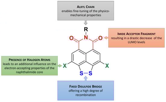To tackle these limitations, we designed the bridged peri-disilfo-substituted 1,8-naphthalimide core structure shown on Figure 2. The main advantage of this architecture is the fixed dichalcogenide bridge, offering a high degree of recombination and hence good electrochemical reversibility. Furthermore, the dithiole cycle is aromatic, which makes its reconstruction even more favorable. Another benefit is the presence of an imide acceptor fragment, perfectly positioned peri to the disulfide bridge, which should lead to a drastic decrease in the LUMO levels and hence a significantly easier progress of the reduction process. Additionally, it is possible to fine-tune the physical and mechanical properties (solubility, crystallization ability, thermo- and chemostability, etc.) by varying the type and length of the alkyl chain at one hand, as well as the electron-accepting properties of the naphthalimide core due to the presence of different halogen atoms in positions 3 and 6 on the other.