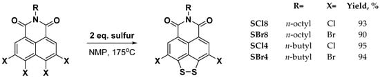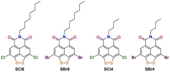 The optimized conditions were then applied to the rest of the tetrahalogen-substituted imides also. The reaction between 4 and sulfur afforded the final product, SBr8, in high yield (90%) on a gram scale. The N-(n-butyl)-substituted imides 5 and 6 also reacted with sulfur under the same conditions as their n-octyl analogues with even higher yields (Scheme 2). In this case, only imide SCl4 had sufficient solubility to allow for purification via column chromatography. The other target product, SBr4, was purified via recrystallization from dioxane. All final products were obtained in very high yields and purity and have been characterized by means of 1H, 13C{1H}-NMR spectroscopic techniques, and elemental analysis (see Section 2 and Supplementary Materials).