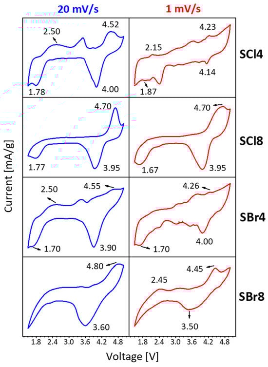 CV curves in a broad potential range (1.5–5.0 V) at a scanning rate of 20 mV/s (left) and 1 mV/s (right) for SCl4, SCl8, SBr4, and SBr8. As an electrolyte, ionic liquid comprising 1M LiTFSI-Pyr1,3FSI solution is used.