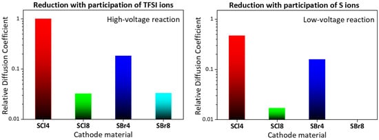 To rationalize the different kinetics of low- and high-redox reactions, the CV curves are analyzed based on the dependence of the current (i) on the scan rate (v). By increasing the scan rate from 1 mV/s to 100 mV/s, the current of both low- and high-voltage bands increases obeying a v1/2-dependence. This evidence the occurrence of diffusion-controlled reactions in low- and high-voltage regions. From the slope of the observed dependence (di/dv1/2), the diffusion coefficient, D, can be estimated using the Randles–Ševčík equation [38]; at 25 °C, the D can be expressed by D = [(di/dv1/2)/(2.69 × 105 n3/2 A C)]2, where n is the number of electrons, C reflects the charge concentration, and A is the electrode surface area. In order to avoid the uncertainties in defining the real values for n, C, and A parameters, we used the relative diffusion coefficient with an aim to compare more accurately the effect of the halogen substituents and the alkyl chain length on the redox reactions of peri-derived compounds: D/DSCl4 = (di/dv1/2)2/(di/dv1/2)2SCL4, where DSCl4 is used as a reference value. The calculated values are given in Figure 4. Two features can be highlighted. First, the diffusion coefficient for high-voltage redox reaction exceeds more than two times that of the low-voltage reaction. This means that the high-voltage redox reaction (classified as p-type) proceeds faster than the low-voltage redox reaction classified as n-type. The established different kinetics for high- and low-voltage redox reactions are in good agreement with previous findings on p- and n-type organic electrode materials [36,39]. On the other hand, this supports once again the assignment of high-voltage redox reactions to oxidation of peri-substituted compounds followed by bonding with TFSI− electrolyte anions, while the low-voltage redox reaction comes from the reduction of the sulfur moiety, including reversible cleavage and formation of the S–S bond by Li+ cations.