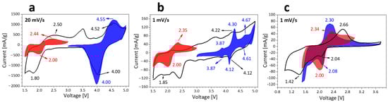 CV curves of SCl4 recorded in low-voltage window between 1.5–3.0 V and high-voltage window between 3.0–5.0 V at a scan rate of 20 mV/s (a) and 1 mV/s (b). For the sake of comparison, the CV curve in an extended voltage window between 1.5 and5.0 V is also given. CV curves recorded in a potential range of 1.5–3.0 V (red), 1.5–3.75 V (blue), and 1.0–3.75 V (black lines) (c).