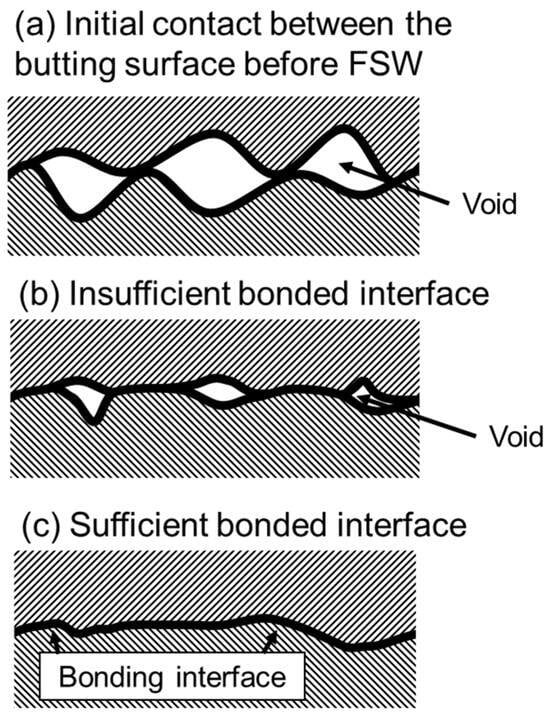 Following the concepts in the literature [46,47,48], SSB can be described as an interfacial thermal-mechanical processes. Figure 3 illustrates the different bonding states between the butting surfaces. As illustrated in Figure 3a, a very small fraction of the contacting butting surfaces is in real contact, because of the surface roughness. During FSW, the butting surfaces experience high temperature, high pressure and severe plastic deformation; as a result, the surface asperities collapse and thus the butting surfaces will be in intimate contact. As the metallic bond is formed between the positive ions and free electrons and is non-directional and unsaturated, solid-state bonds form between butting surfaces when the distance between the surfaces is below a critical value [38]. If the butting surfaces fail to form a bond, a residual void would exist at the interface, as shown in Figure 3b, which degrades the joint properties. What we expect is a sufficient bonding, shown in Figure 3c, where the interfacial void is eliminated. Therefore, a certain thermal-mechanical condition is required for the closure of the interfacial void and thus the successful bonding between the butting surfaces.