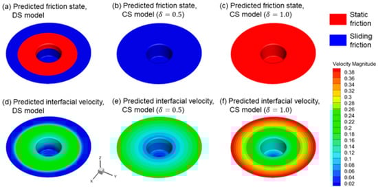 An appropriate model for the interfacial friction between the welding tool and the workpiece is important for prediction of the combined thermal and mechanical condition and the material bonding behavior in the vicinity of the welding tool during FSW, as the interfacial friction is the underlying process that governs both the heat generation and the material flow. In Figure 4, the predicted friction state and the workpiece velocity at the interface using the DS model and the constant sticking (CS) model are plotted in Figure 4a–c and Figure 4d–f. The use of the DS model in the CFD simulation allows the automatic transition between the sticking state and slipping state at the interface, and thus the predicted contact state varies over the tool/workpiece interface, as shown in Figure 4a. What is noticeable is that a significant interfacial slipping occurs at the shoulder periphery and the bottom part of the pin, which results in slower flow velocity in the workpiece at these locations, as shown in Figure 4d. The capability of predicting a more realistic interfacial contact state is considered a major virtue of the DS model. In comparison, the contact state is considered as constant when the CS model is used, which is either slipping friction (Figure 4b) or static friction (Figure 4c), which may result in an over- or under-estimation of the flow velocity and deformation rate. In principle, the contact state at the tool/workpiece interface can be considered to be either sticking or slipping, based on the workpiece velocity. Generally, if the sticking presents at the interface, the workpiece velocity is considered to be very similar to that of the welding tool, which allows very fast material flow and minimum interfacial slipping; thus, much heat is generated from the high-rate plastic deformation. Otherwise, if slipping presents, less material flow will be caused, and in this case heat will be generated from the interfacial friction sliding.