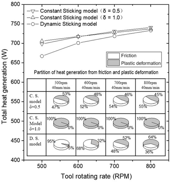 The heat generation in FSW is divided into the frictional heating and the plastic deformation heating. When integrating the heat flux calculated using Equations (9) and (10), the total heat generation is obtained. The total heat generation in different welding conditions is shown in Figure 5, together with the partition of heat generation from friction and plastic deformation. Obviously, the predicted heat partition changes significantly when the DS model is used. But, for the CS model, the partition of heat from the two types of heat flux at different welding conditions does not change much. Note that the total heat generation by the DS model is slightly less than that of the CS model, and the gap becomes greater when a slower too- rotating rate is used. The reason is that when more significant sliding friction presents at lower rotation rates, the plastic deformation heat is over-predicted by the CS model.