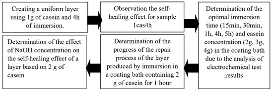 In order to determine the most favorable technological conditions to obtain self-healing coatings, the following research plan was devised (Figure 1).