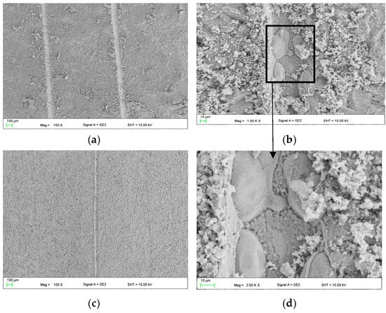 Then, the self-healing effect of the coating was assessed. A scratch was made on the 1cas4h sample (Figure 4a). At the edges of the scratch, deformation of the coating and traces of the blade in the middle part of the scratch are visible. A sample with a 1cas4h coating with a scratch was immersed in Ringer’s solution for 1 h, shown in Figure 4b. In order to determine the degree of “repair” of the coating, morphological changes in the area of the intentionally made scratch were examined. SEM observations revealed that the morphology of the scratch surface has changed. The blade traces in the central part of the scratch are invisible. In addition, conglomerates similar to fragments of the shell morphology were observed (Figure 4b). The area with a round-like element is marked in the black frame, suggesting the beginning of the “repair” process of coating.