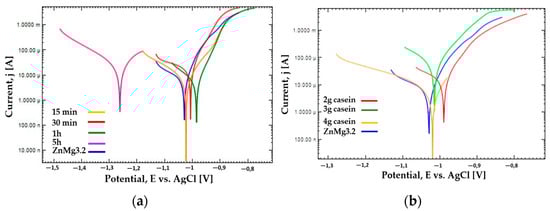 Potentiodynamic curves in Ringer’s Solution at 37 °C for uncoated substrate and samples coated with different immersion times (a) and different concentrations of casein (b) in the coating bath.