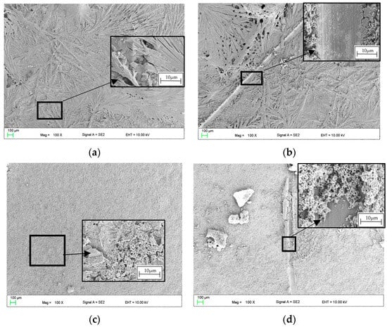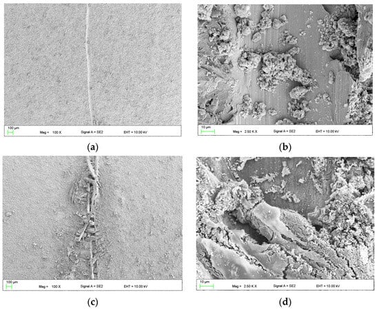 The coating’s morphology is defined by crystal-like branches that create a cohesive layer on the surface of the substrate (Figure 6a). The scratch evident in Figure 6b displays blade traces in the center and coating deformation at the edges. After an hour-long immersion in Ringer’s solution at 37 °C, the casein layer in Figure 6c exhibits enhanced surface development. Notably, within the scratch area in Figure 6d, there is an almost “repaired” appearance, featuring elements resembling the structure of the coating found outside the scratched region. To assess the impact of NaOH concentration on the self-healing capabilities of the 2 g casein-based layer, coating baths were formulated with 2 g NaOH (2naoh2cas) and 4 g NaOH (4noah2cas). Subsequently, samples were immersed in these baths for 1 h. Following drying, the coated samples underwent a 1 h immersion in Ringer’s solution at 37 °C. The observed outcomes regarding the self-healing effect of the layer after this hour-long immersion in Ringer’s solution are presented in Figure 7. Lowering the concentration to 2 g of NaOH (Figure 7a,b) in the coating bath does not produce the self-healing effect. No notable indications suggestive of the layer self-repairing were observed. Conversely, a layer formed in a bath with 4 g of NaOH exhibits significantly improved self-healing effects. Distinctive overhangs and even “ribs” connecting both edges of the crack (Figure 7c,d) are visible, likely resulting from material sourced from the coating and subsequent reaction with the solution.