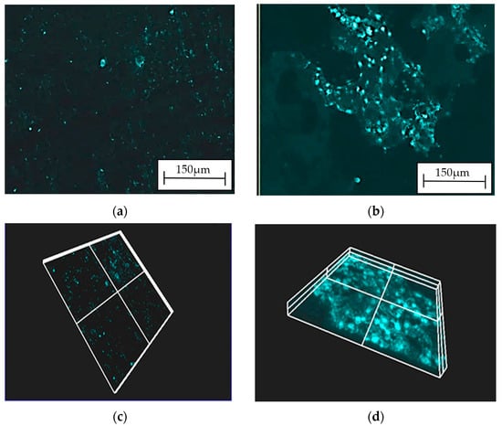 Confocal images of U2OS cells with DAPI-stained nucleus after 7 days of incubation on casein-based layer (2cas1h) on tested materials: ZnMg3.2 alloy (a); casein coating (2cas1h) (b). Additional 3D visualization from Immaris software (Bitplane Scientific Software; version 10.0.0; Olympus, Zurich, Switzerland) for ZnMg3.2 alloy (c), casein coating (2cas1h) (d).