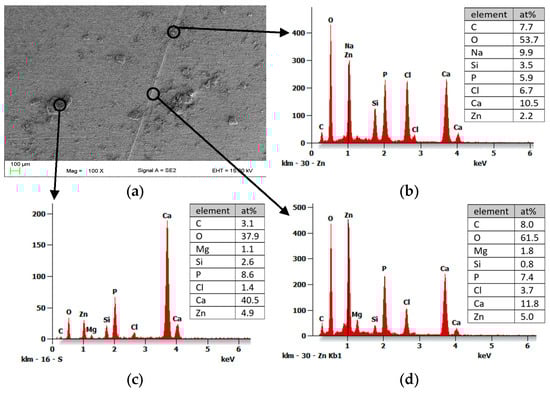 In the location of the scratch, along with visible agglomerates on the edges and in the middle (Figure 9b), P, and Ca, which contains hydroxyapatite in its composition, were detected. In turn, the presence of chlorine most likely comes from the Ringer solution. Silicon is rather an impurity from the dip-coating process or constituent elements. The result of EDS analysis also indicated the presence of a large amount of zinc (Zn), which comes from the substrate and to a large extent may also come from zinc oxide, which is a transformation product of Zn(OH)2 produced in chloride environments [10]. The clusters visible in the coating are probably coagulated nanoHAp powder, judging by the high peak from Ca (Figure 9c). The EDS result shown in Figure 9d, in turn, is from the crack area in which there are no such significant coagulations and agglomerates. The presence of analogous elements, as those observed in the EDS data from Figure 9b, was identified. With the exception of one sample, the presence of magnesium (Mg) was detected. Additionally, the zinc (Zn) peak appeared notably higher. This may indicate an uncovered substrate, uncoated or partially coated. Another potential explanation for the presence of magnesium (Mg) in the EDS results could be the existence of a eutectic or another structural phase within this specific area of the substrate.
