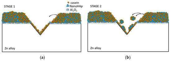 Based on the findings of this study, it can be concluded that there is a self-healing effect observed in the casein-based layers. The mechanism of this phenomenon is presented graphically in Figure 10. This study’s results reveal a two-stage self-healing mechanism observed in the casein-based layers investigated. The first stage likely involves the hydrolysis of casein, resulting in its infiltration into the scratch. This is observable as round elements within the scratched area and overhangs along the scratch’s edges. Stage 2 involves the migration of nanoHAp particles, bound within the casein, toward the scratched area. This process leads to the formation of “ribs” that connect the edges of the scratch. Both stages probably occur simultaneously, only to a different extent, in different scratch areas. It seems that nanoHAp particles play two roles: as a component of the self-healing layer and as a reservoir of casein as a healing agent. On the other hand, casein also has two roles: as a component of the healing film and as a courier of nanoHAp molecules as healing ingredients. Therefore, these materials play complementary roles, making the nanoHAp-casein coating self-healing.