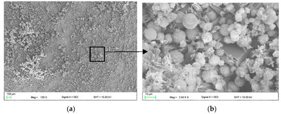 SEM images of casein 1cas4h coating with NanoHAp addition showing surface morphology (a) where star-shaped elements may be distinguished at higher magnification (b).