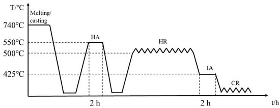 The compositions of the Al-Ca and Al-Ca-Fe systems were determined according to the chemical analysis performed by ICP-OES (Agilent 720ES, Agilent Technologies, Santa Clara, CA, USA). The Al-Ca alloy containing 3.63%Ca, 0.17%Fe and Al-Ca-Fe alloy containing 3.63%Ca, 1.03%Fe were synthesized, and Fe (10%Fe and 90%Al reagent) and Ca (10%Ca and 90%Al reagent) were added via master alloys (all contents given in wt.%). The melting process of the alloy was carried out in a resistance furnace in an air environment. After the refining process, the two alloys were held between 720 °C and 740 °C for 30 min and then cast into a cylindrical copper mold (140 mm in width, 80 mm in height, and 12 mm in thickness). After homogenizing annealing (HA) at 550 °C for 2 h, the alloys were hot rolled (HR) on a laboratory two-roll mill from 12 mm to 2.4 mm. During the hot rolling process, the furnace temperature was maintained at 500 °C. After the sample was held for 20 min, the first rolling was performed with a reduction of approximately 0.5 mm. After two consecutive rolling passes, the sample was reheated and held in the furnace for 5 min before being taken out for the next rolling pass. Intermediate annealing (IA) was carried out at 425 °C for 2 h, and then the alloys were cold rolled (CR) from 2.4 mm to 1.2 mm. The reduction in each cold rolling pass was approximately 0.5 mm. The scheme of the experiments and the main stages of the processing route are summarized in Figure 1.