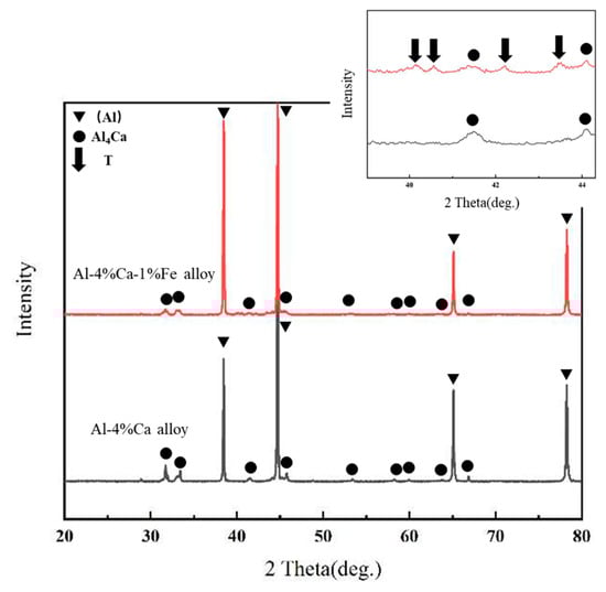 The XRD results showed that a new phase was formed, as shown in Figure 2. The α-Al diffraction peaks were detected in both samples. In addition to α-Al, the diffraction peaks of the Al4Ca phase are relatively weak but still identifiable. Compared with that of the Al-Ca alloy, some weak diffraction peaks that did not belong to α-Al or Al4Ca were also detected in the as-rolled XRD diffraction pattern of the Al-Ca-Fe alloy, which indicated that a small new amount of the Al-Ca-Fe phase is formed in the Al-Ca-Fe alloy, and temporarily labeled as T phase (ternary phase).