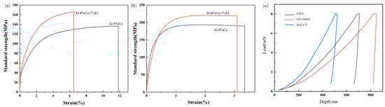 Stress-strain curves of Al-Ca alloy and Al-Ca-Fe alloy (a) as cast; (b) as rolled; (c) nanoindentation load-depth curve of different phases.