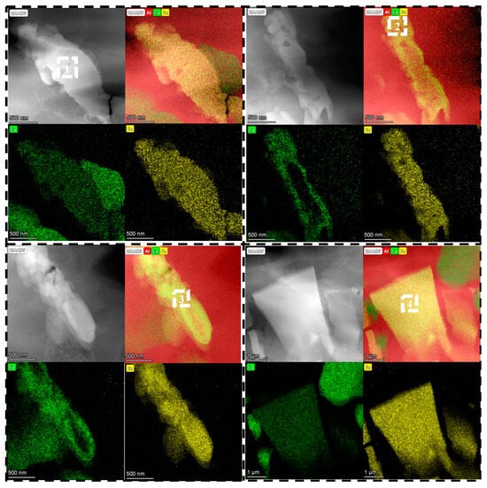 STEM EDS mapping results of four different regions of the as-rolled Al-Ca-Fe alloy with green representing Ca and yellow representing Fe, and the energy spectrums of the selected regions are shown in Table 4.