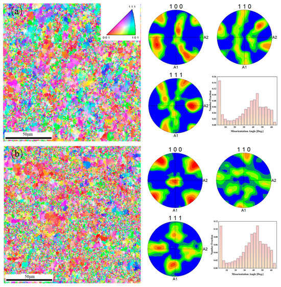 EBSD IPF maps, PF images, and misorientation angle distribution of experimental alloys: (a) Al-Ca alloy; (b) Al-Ca-Fe alloy. The histograms quantify the distribution of the misorientation angle values, with a shift to a lower misorientation angle for Al-Ca-Fe alloy.