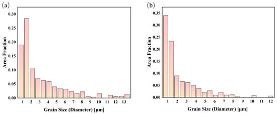 Grain size distribution (total normalized fraction = 1) of experimental alloys: (a) Al-Ca alloy; (b) Al-Ca-Fe alloy.