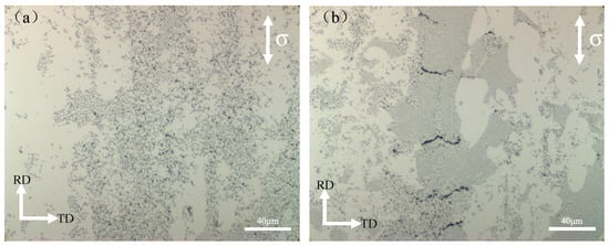 Figure 10 is the OM images of the tensile fracture outer section of the Al-Ca alloy and Al-Ca-Fe alloy as rolled. Comparing the two figures, we found that the Al4Ca of the Al-Ca alloy presented a uniformly distributed spherical shape, which was completely different from the as-cast structure. The network structure completely disappeared, and the pores were dispersed in the matrix of the Al4Ca phase dense area. The eutectic Al4Ca + T phase of the Al-Ca-Fe alloy was finer, the network-like fibrous structure was retained along the rolling direction, and the transverse network structure disappeared. The pores were concentrated in the matrix of the Al4Ca + T phase dense area and formed transverse microcracks after aggregation. Figure 10b showed that the pores aggregated and formed secondary cracks in the Al4Ca + T phase, indicating that the Al4Ca + T phase had a higher strength compared to the pure Al4Ca and therefore bear the load preferentially, which made the alloy have better mechanical properties. At the same time, it was observed that the smaller the particles, the more obvious the strengthening effect [14]. These fracture behaviors revealed that the concentrated distribution of the Al4Ca + T phase and the fine spherical morphology provided additional strength enhancement to the alloy. In summary, the presence of a fine globular phase, small-sized grains surrounding the particles, and a high-volume fraction of the eutectic phase collectively contributed to inhibiting the early formation of pores and hindering crack propagation, ultimately preventing failure.
