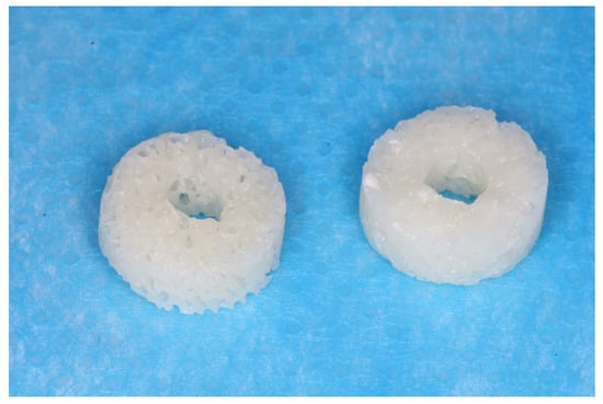 SpBlock is a xenograft block of exclusively collagenated cancellous equine bone (Tecnoss, Giaveno, Italy). This process prevents the ceramization of hydroxyapatite crystals, aiming to accelerate resorption. The blocks were cylindrical with diameters of 7 mm and thicknesses of 3 mm. A hole, in the dimensions of the implant, was prepared in the center of the blocks (Figure 1). The central hole in the blocks was created using a sequence of drills at a speed of 800 rpm and 20 N/m under constant irrigation with 0.9% saline solution until a final diameter of 3.3 mm was obtained, corresponding to the diameter of the implant designated for fixing the blocks.